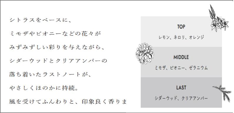 シトラスをベースに、ミモザやピオニーなどの花々がみずみずしい彩りを与えながら、シダーウッドとソフトアンバーの落ち着いたラストノートが、やさしくほのかに持続。